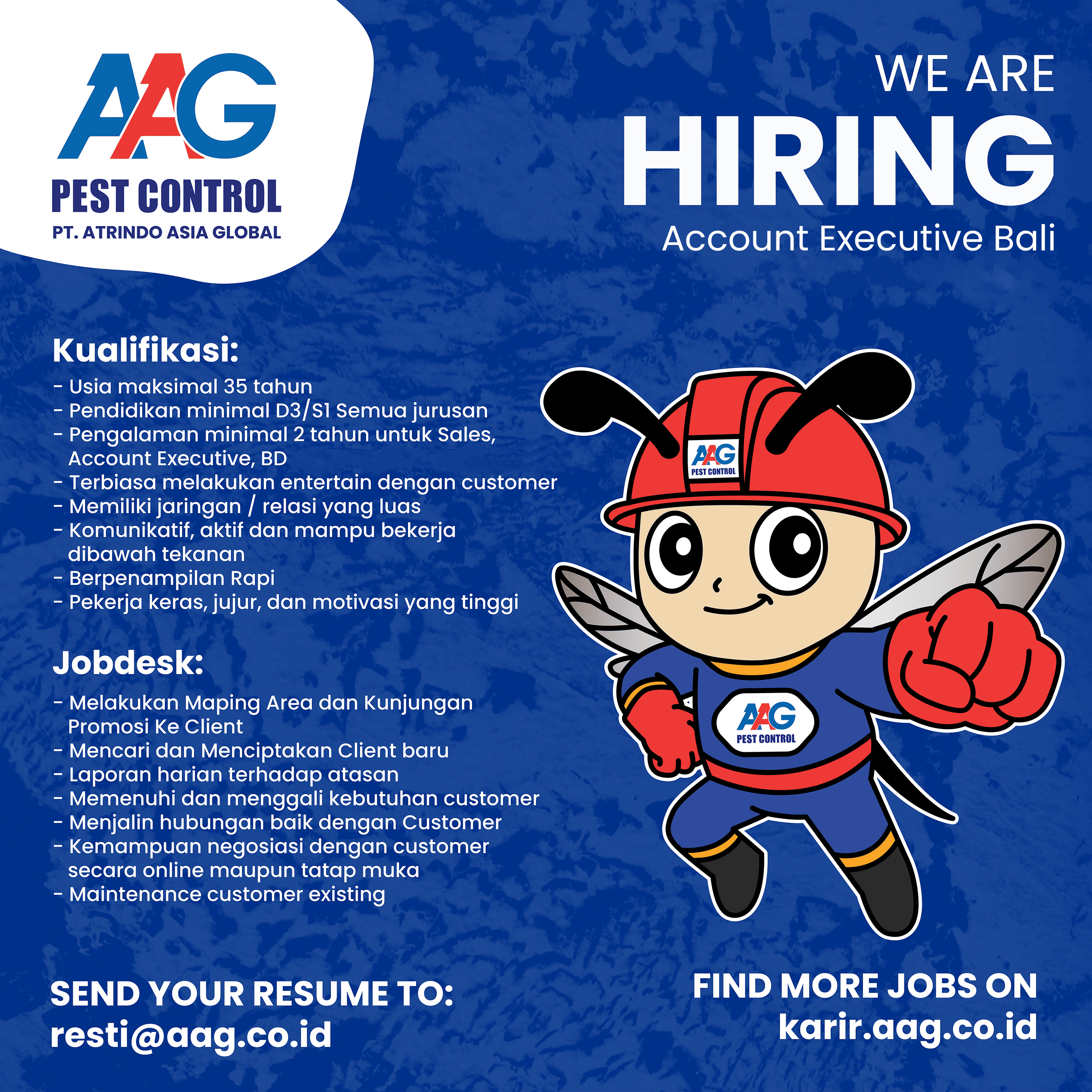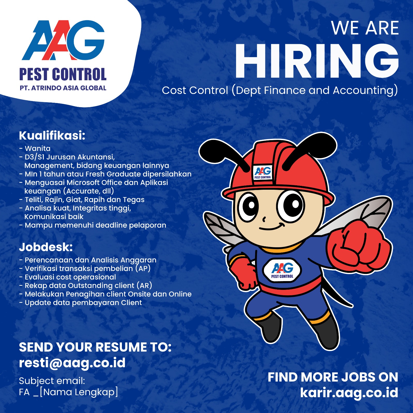 Sumber Daya Manusia (SDM) adalah aset utama Atrindo Asia Global (AAG) dalam menjalankan kegiatan bisnis. Kami percaya untuk mencapai keberlanjutan dan kesuksesan bisnis, AAG perlu untuk merekrut sumber daya manusia yang kompeten, berkualitas, yang siap bekerja sama untuk . Menghadapi tantangan bisnis yang semakin ketat, AAG membantu membangun karakter dan kompetensi SDM agar terus berkembang menjadi insan korporasi yang kreatif, inovatif dan kompetitif. Peluang karir, budaya kerjasama, apresiasi, kompensasi dan benefit yang menarik merupakan komitmen AAG terhadap sumber daya manusianya.